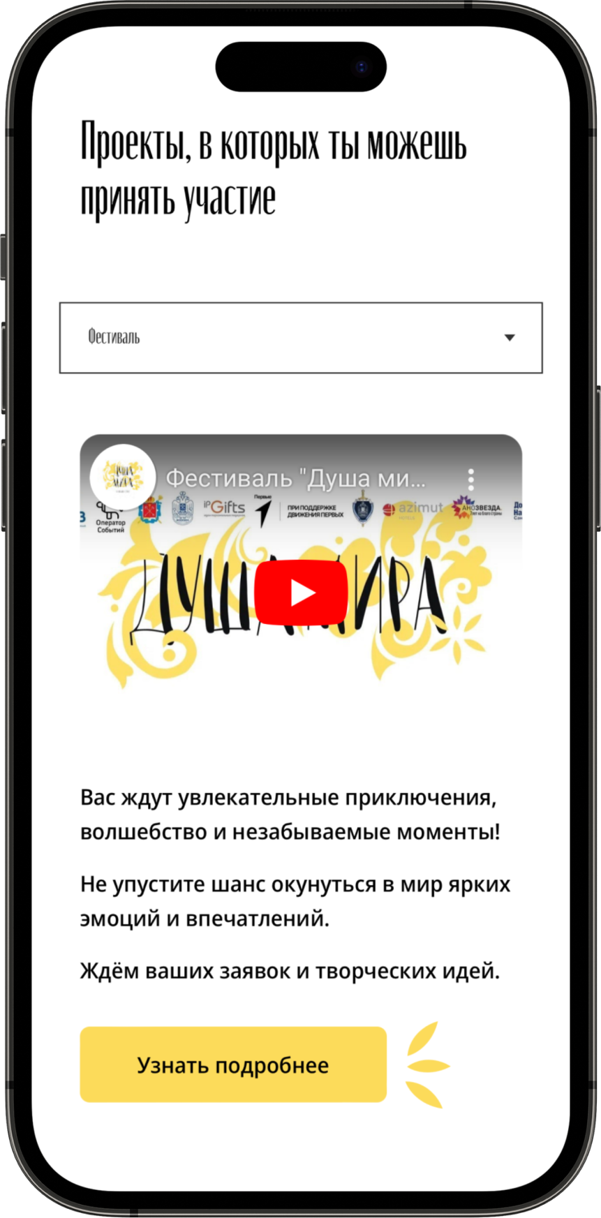 Задача сайта — привлечь молодёжь к проекту, заинтересовать их участвовать в мероприятиях проводимыми сообществом: тренинги, лекции, фестивали и многие другие.