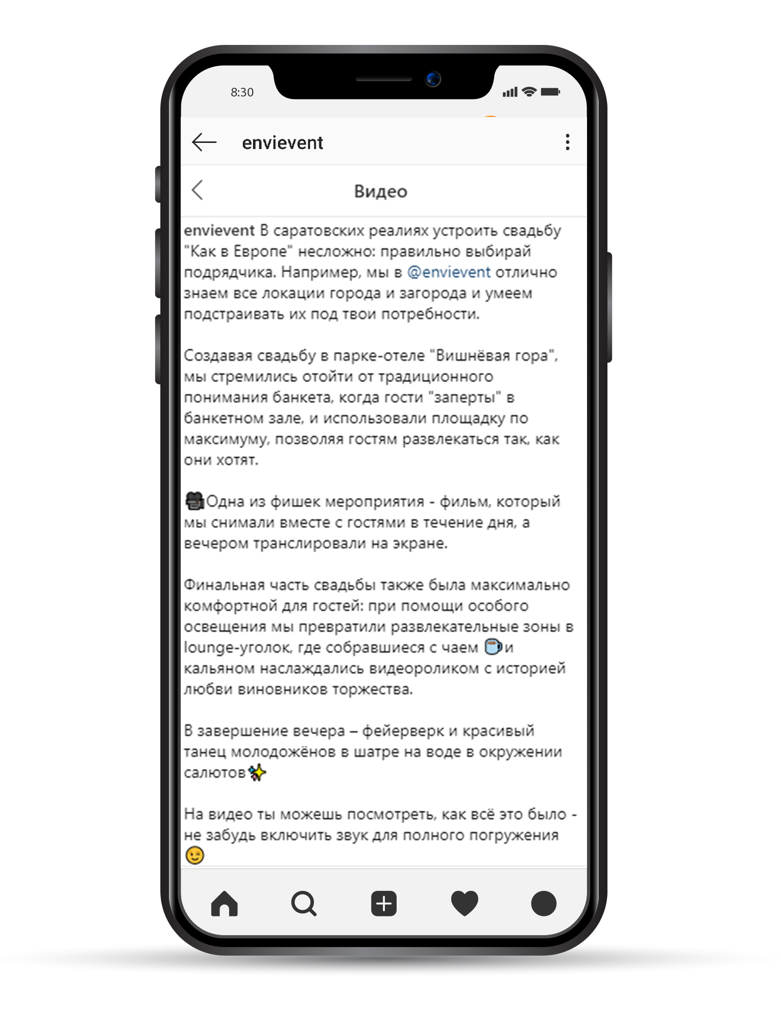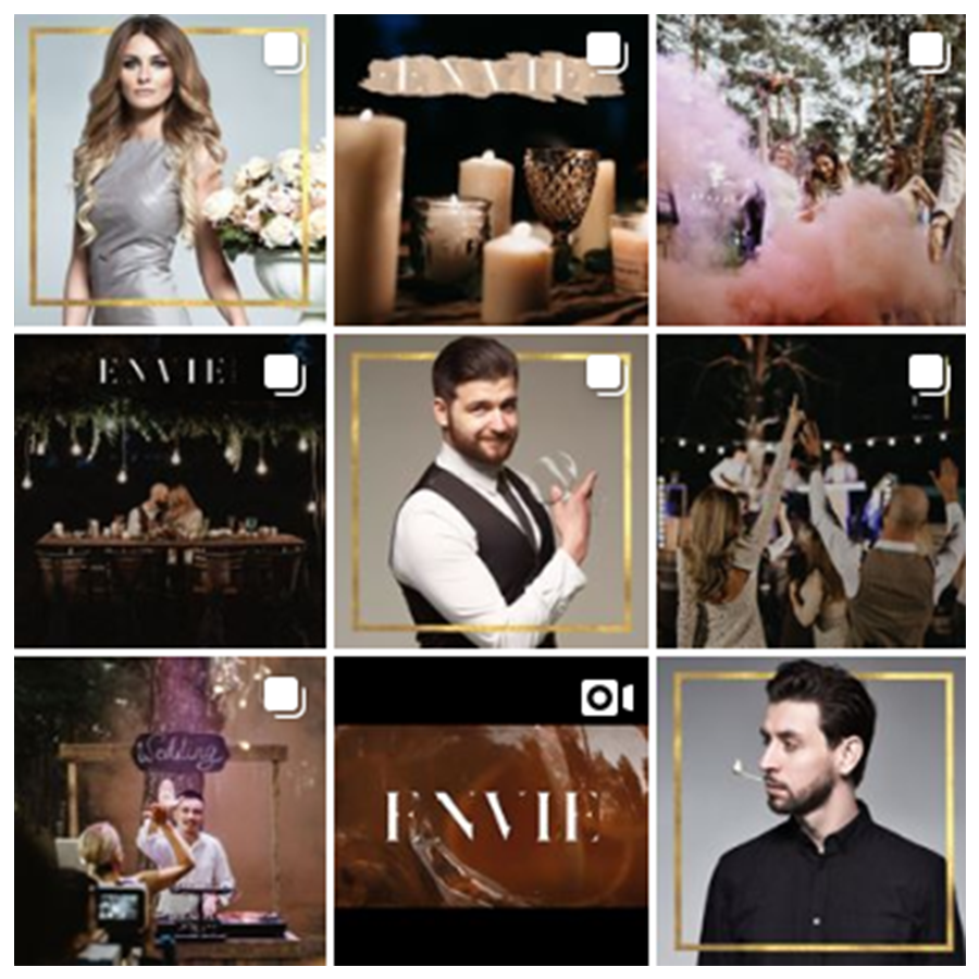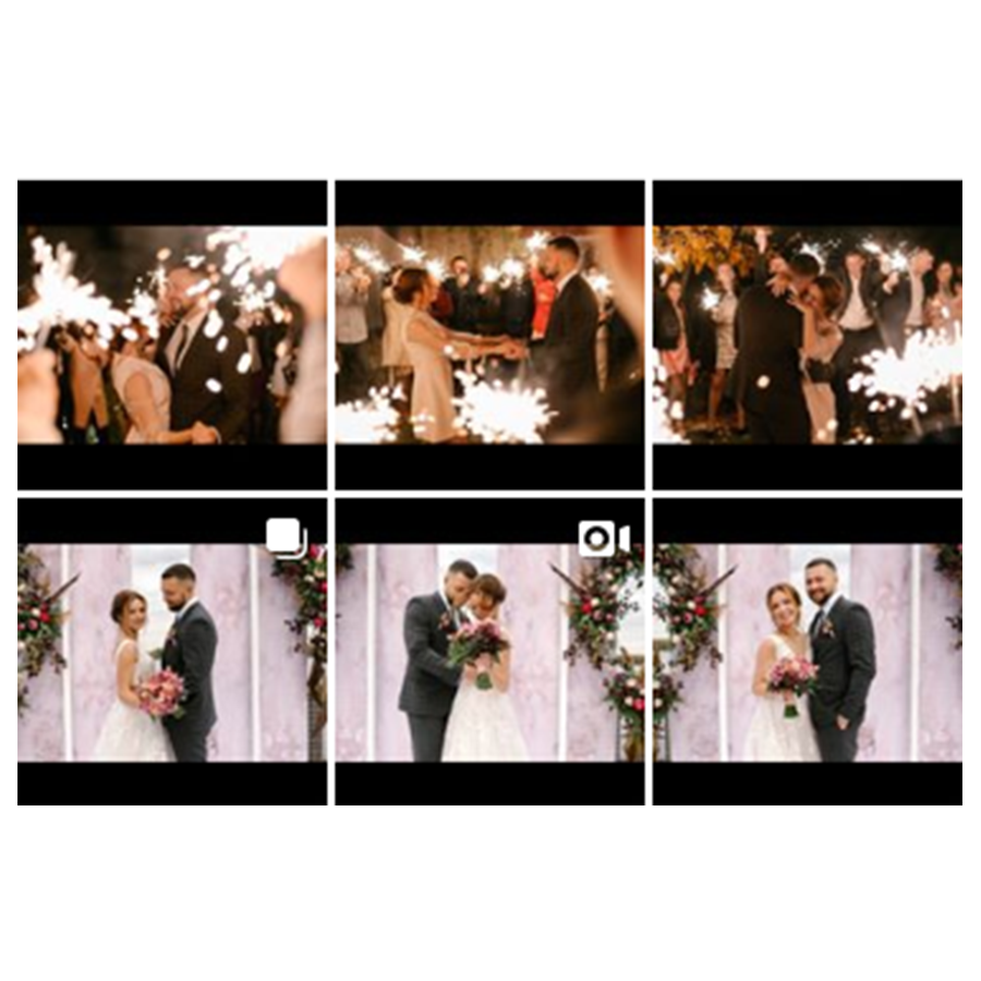 Фотографии стали набирать по 70−90 лайков при аудитории аккаунта на тот момент немногим больше 300 человек. Для того, чтобы аккаунт выделялся на фоне других, мы сделали его тёмным в противовес светлым свадебных аккаунтам в воздушной бело-розово-золотисто-голубой гамме. Блоки свадеб оформляли строго и брутально. Ниже два примера: