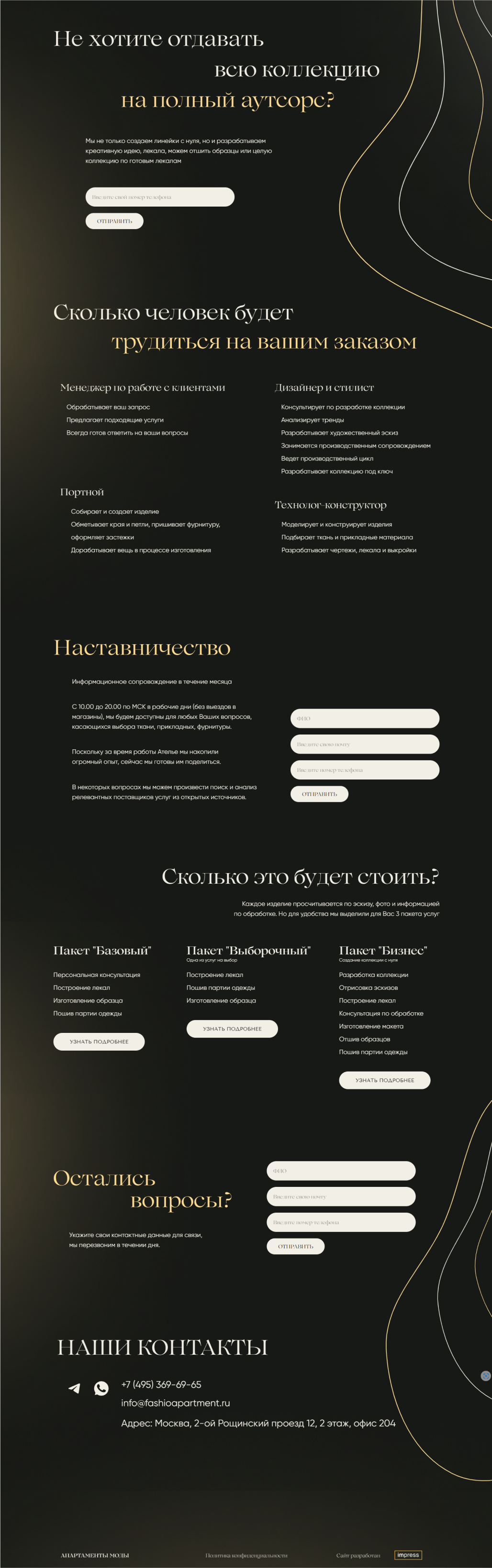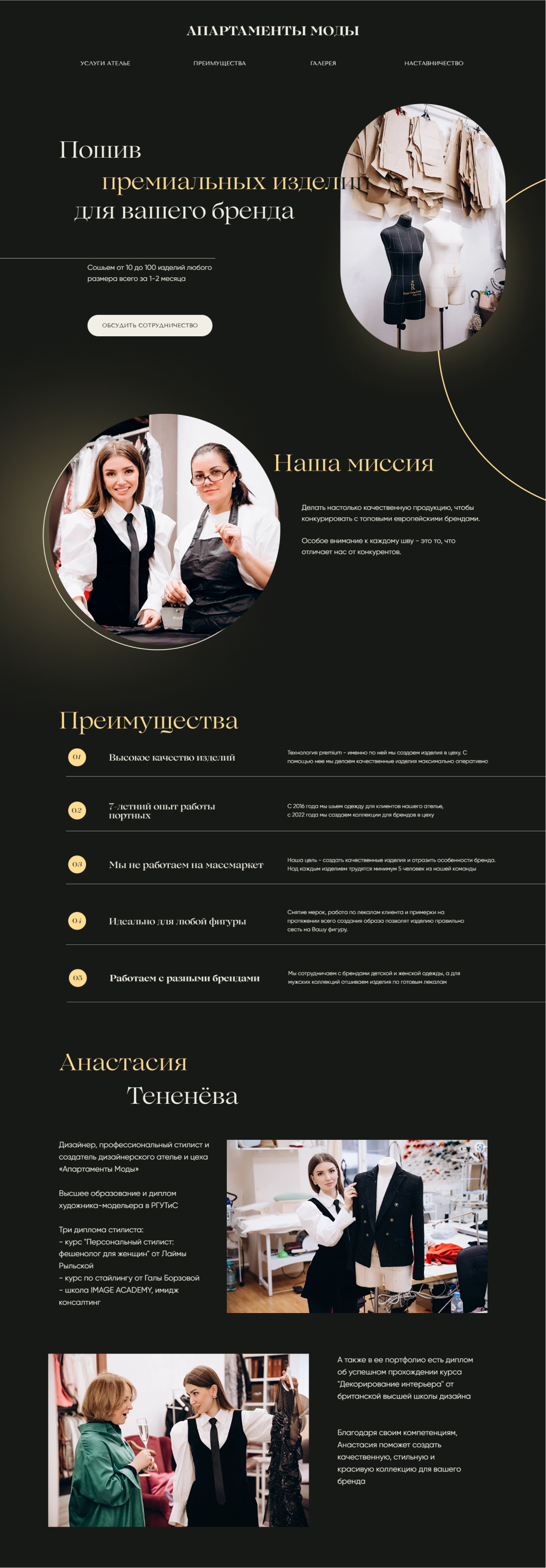 Апартаменты моды — это ателье, специализирующееся на премиальном пошиве женской одежды с высоким чеком.