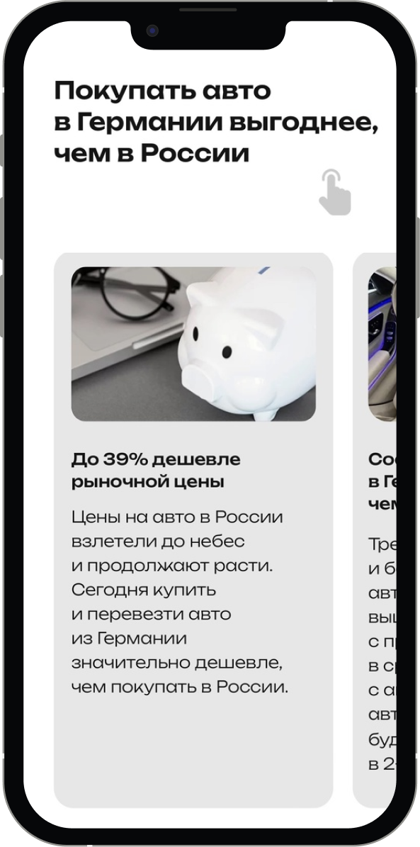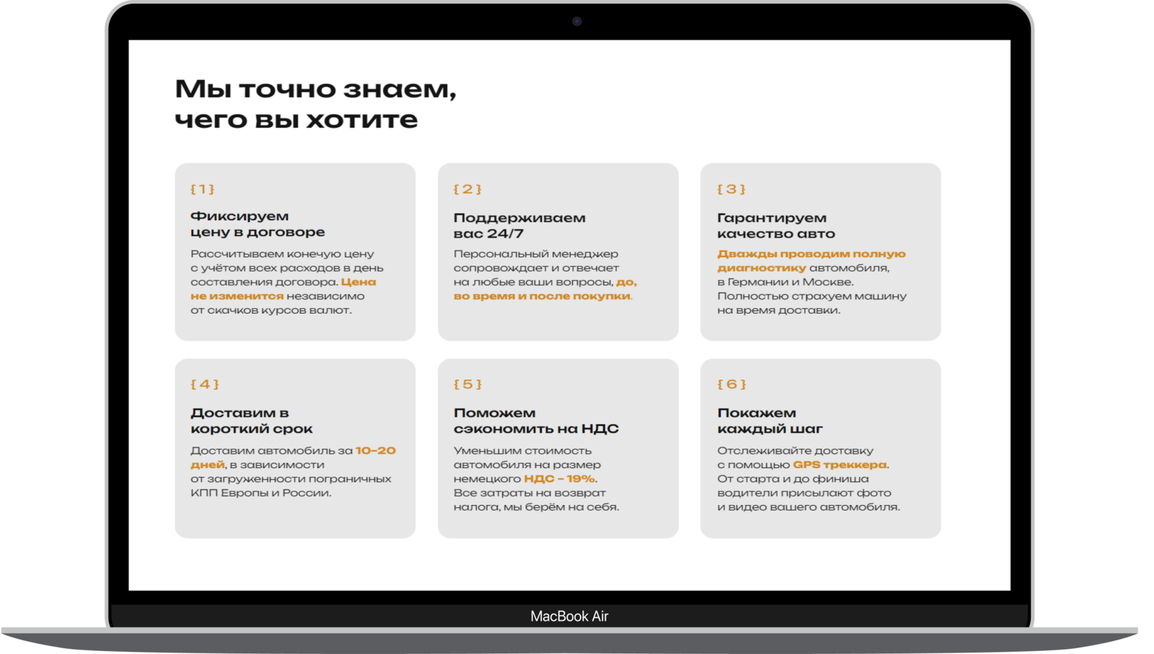 Анализ конкурентов показал, что в России не так много больших и сильных игроков, занимающихся покупкой и перегоном машин из Германии. В основном это небольшие компании, перекупщики и перегонщики у которых нет сайтов и слабо упакованные соцсети. В первую очередь нам было необходимо отстроиться от них, а потом уже выделится среди крупных конкурентов за счёт лучшего сервиса и скорости доставки.